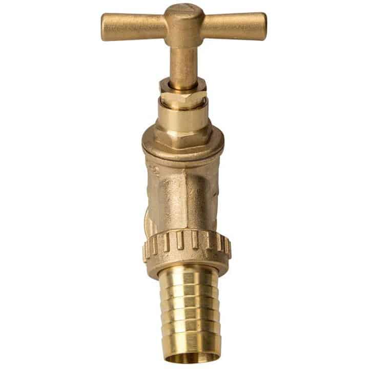 The bibcock is connected to a water source on one end and the other end is an outlet