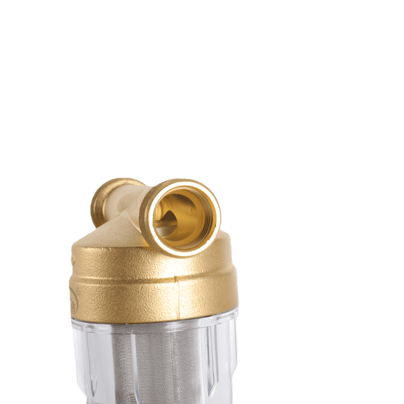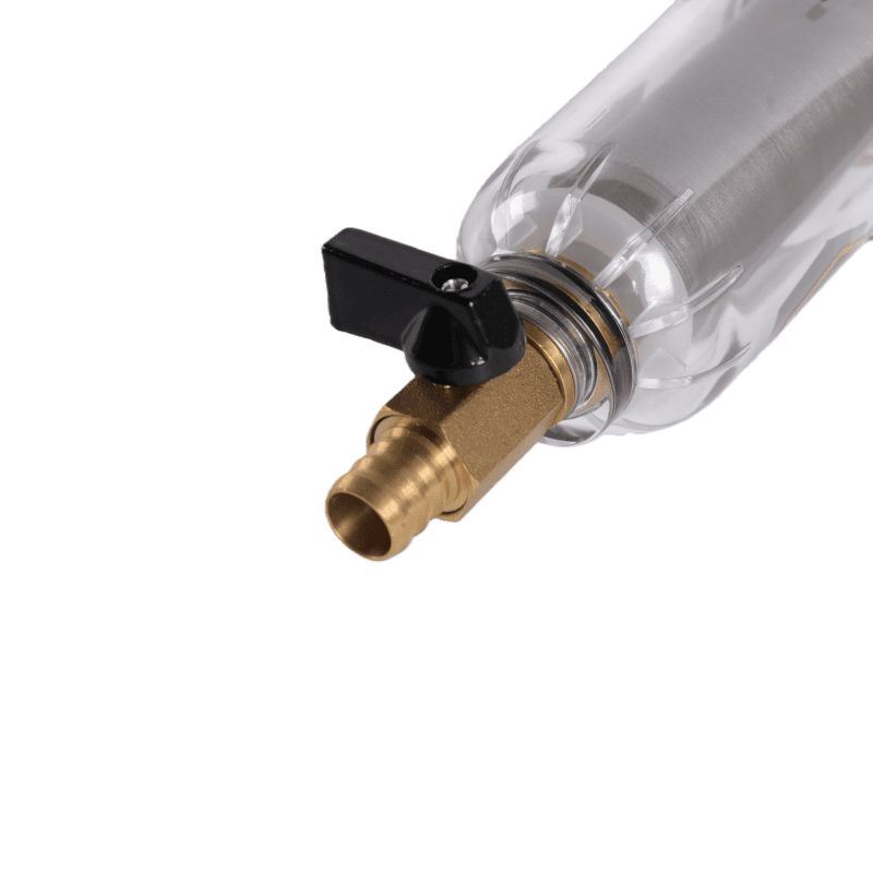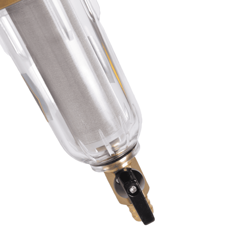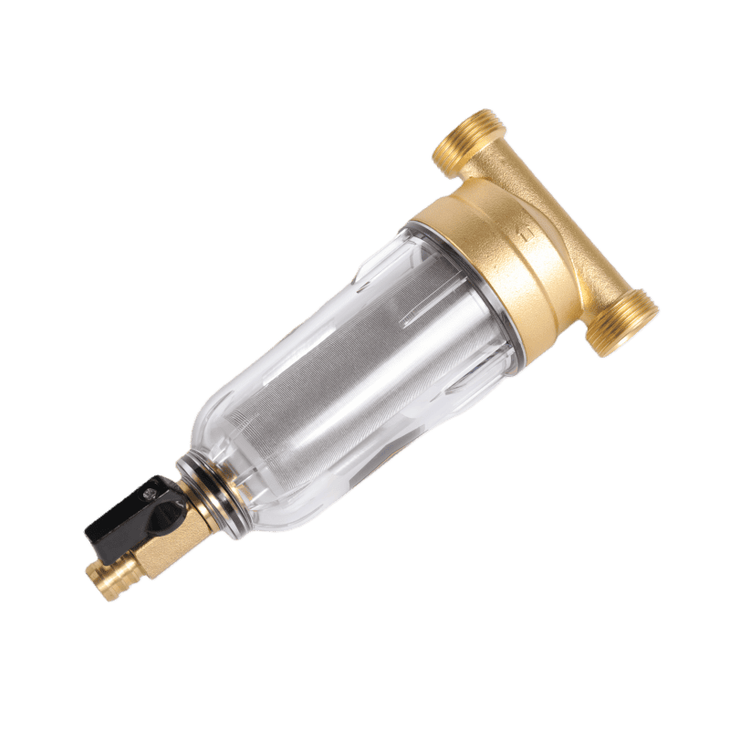 This brass clear-housing pre-filter is made with a lead-free brass body and a transparent PP housing. A stainless steel filter element is built inside. It is used as a pre-filter in home water supply systems. The filter has straight-through flow and threaded connections on both ends. A blowdown ball valve is installed at the bottom. The clear housing allows users to see dirt and buildup inside. The stainless steel filter catches large particles like sand and rust. The filter is usually installed at the inlet of household water pipelines. It works as the first filtration step in home water purification systems.